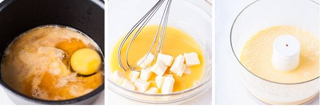 In un pentolino, unire le uova, lo zucchero, il succo di frutto della passione e il succo di limone.