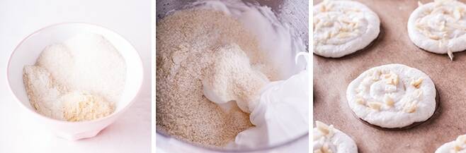 Adagiare i dischi su carta da forno per formare dei cerchi di 6 cm di diametro. Cospargere con mandorle tritate.